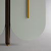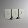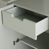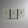 This striking piece offers exceptional functionality. Three curved cabinets open to reveal shelves. Within the center case lies a soft-close drawer for silver or fine cutlery. The lowermost is rounded to hold table linens. Brass plinths are matched by brass pulls—a gorgeous contrast detail against the silvery gray lacquer chests joined by Eucalyptus wood legs finished in a smokey gray.