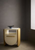 Clad in cream lacquer reminiscent of parchment paper, the CUPOLA End Table features the classic NARRATIVE ARC elliptical silhouette, rotated vertically and spliced through the middle. Its curvilinear body is suspended between two blonde oak panels with rounded edges. A thin, horizontal drawer pull in burnished brass mirrors the shape of the panels. The end table features a soft close drawer and an open cavity for convenient storage. A sibling to the CUPOLA Credenza.