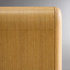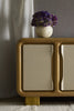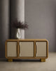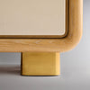 An evolution of its award-winning sibling, the CUSP Cabinet, this credenza features three ivory-leather wrapped doors set against a blonde oak framework. Housed within are two distinct compartments designed for functional storage: on the left, a double-width case with a wide, adjustable shelf intended for large trays and serveware, and on the right, a smaller case for objects and collectibles. Burnished brass feet add flair and create narrative continuity across the collection.