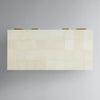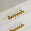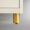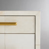 With chic refinement suitable for the finest library, the desk is covered with ivory vellum. The small hides are uniformly joined in four-inch panels and tailored to perfectly align the seams. The hand of this exquisite material elevates the desk, detailed with columned feet of burnished brass, matching drawer pulls, a thin top pencil drawer, a tall left-hand console space, and a hidden media port to allow for cables.