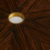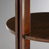 The rich graining of Macassar wood defines radial lines in marquetry extending from a cutout center in both the beveled top and lower shelf. An inset ring of burnished brass is matched by hardware that elegantly joins the seamless legs that form the base. The narrow reveals separating the legs showcase exceptional architectural character. The functional aspect of allowing for the cord of a fine lamp gives this end table tremendous versatility.