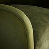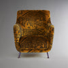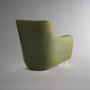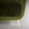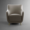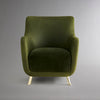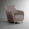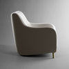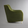 Displaying an unexpected side view, the lounge chair rests upon a back plinth and front angled cast brass legs. Upon a slender deck sits an attached cushion of exaggerated depth. The graceful lines traced by sculpted armrests lend comfort and allure.