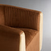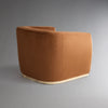 A modern take on the traditional club chair, this barrel lounge chair features a deep waterfall seat, a horseshoe-shaped plinth, and front panels of beautifully grained white oak, carved and sanded for a pillowed effect. Tailored in the customer’s own material, the chair is smartly adorned with uniquely thin channel tufts along the interior of its arms.