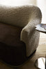 A continuous wave runs atop the detached asymmetrical back. The left arm bears a flat front, while the right arm rounds to a point. The flowing carved, stepped base of white oak also displays an upward curve. The back and seat relationship presents options for tailored upholstery - for play with one fabric in symmetry, or for mix-and-matching two fabric colors or textures.