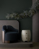 A remix of a traditional circular lounge chair, this oval beauty presents a flared back of padded fins. Upholstered in the customer’s own material, tailoring sees every seam matched. Welting detail can be specified to match the crisp lines. The elliptical back in beautifully finished white oak additionally forms the base.