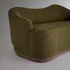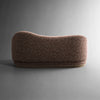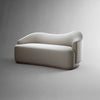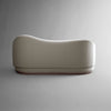 A continuous wave runs atop the detached asymmetrical back. The left arm bears a flat front, while the right arm rounds to a point. The flowing carved, stepped base of white oak also displays an upward curve. The back and seat relationship presents options for tailored upholstery - for play with one fabric in symmetry, or for mix-and-matching two fabric colors or textures.